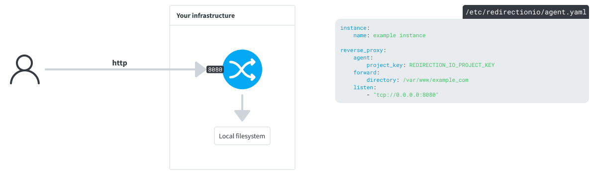 It is possible to use a local directory as a backend for the redirection.io agent reverse proxy. This is useful if you want to use the agent as a reverse proxy in front of a static website, for example.