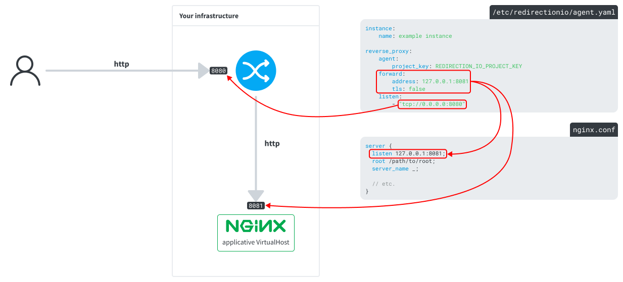 The redirection.io agent bundles a full-featured and highly performant reverse proxy. In the following layout, the agent receives http requests on port 8080, and forwards them to the nginx server on port 8081: