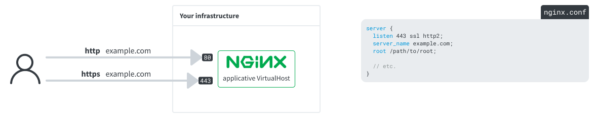 Take a standard and simple nginx VirtualHost. The nginx configuration usually defines several directives (server name, port to listen to, document root, etc.). This will be our base example in the next chapters (the approach with another Web Server, like Apache, would be very similar).