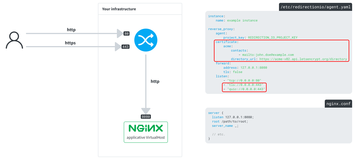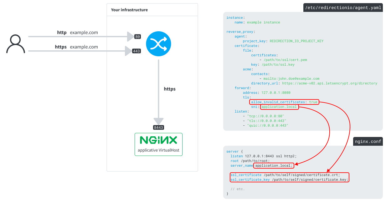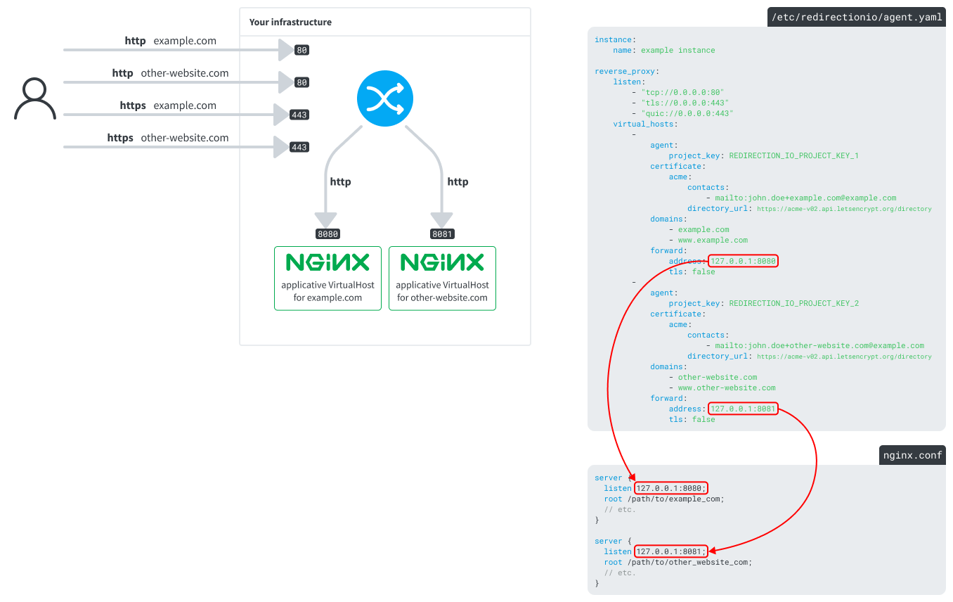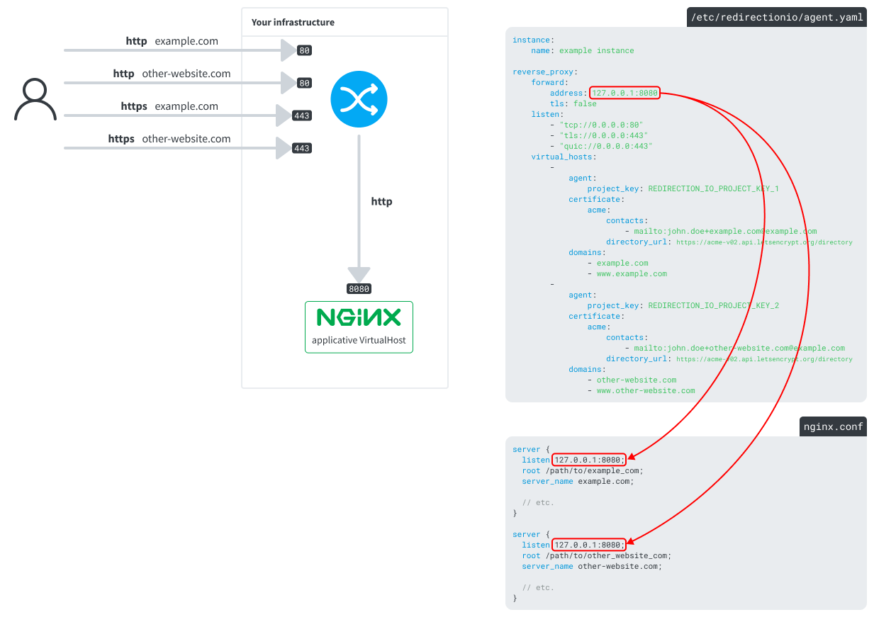 As a standalone reverse proxy, the redirection.io agent can easily be configured to work in all types of layouts: